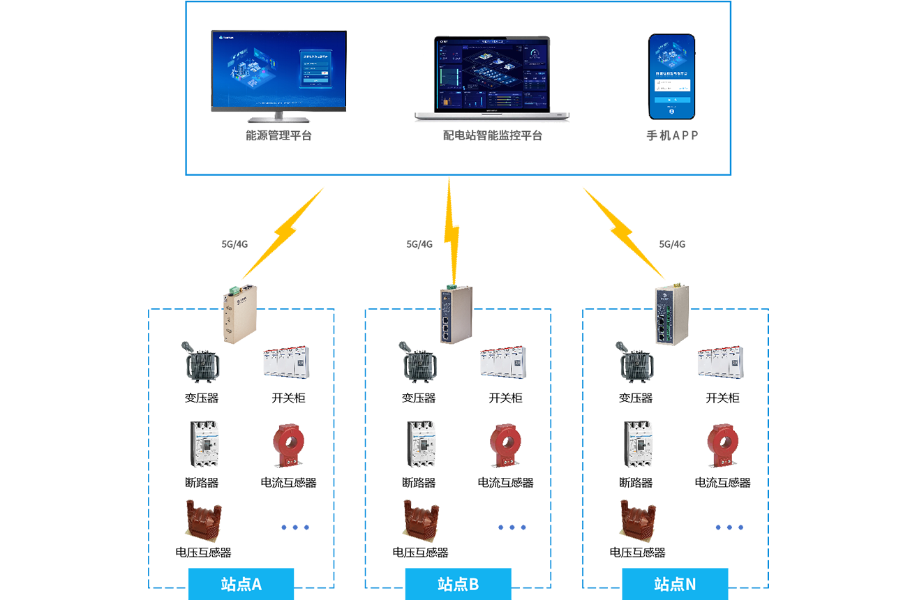 通過物通博聯(lián)的能源電力網(wǎng)關(guān)采集配電站的各類設(shè)備(如變壓器、開關(guān)柜、斷路器等)將采集到的配電數(shù)據(jù)(如電流、電壓、溫度、濕度等)傳輸至配電站智能監(jiān)控平臺。平臺實時監(jiān)測設(shè)備狀態(tài),當(dāng)出現(xiàn)異常或故障時及時發(fā)出預(yù)警,并提供故障診斷和處理指導(dǎo)。同時具備電能質(zhì)量監(jiān)測功能,支持遠程運維操作和負荷優(yōu)化管理。