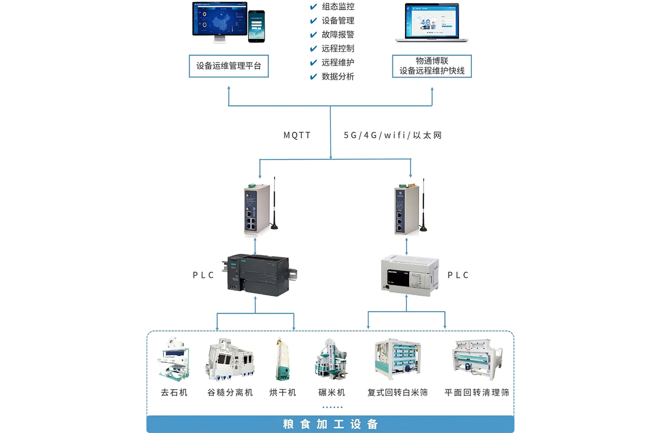 通過網關采集糧油機械設備的PLC,網關具有多種PLC的協議兼容能,同時支持5G/4G/WIFI/以太網等方式對接到云平臺或上位機中。