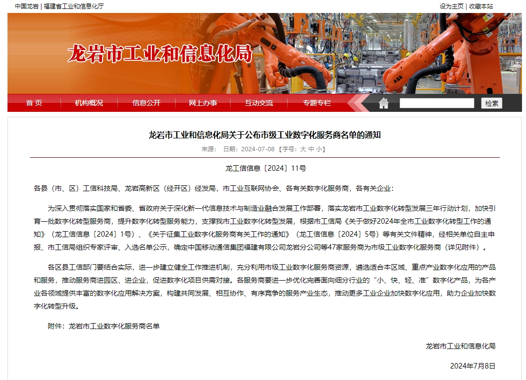 7月8日,龍巖市工信局公布了《龍巖市工業(yè)和信息化局關于公布市級工業(yè)數字化服務商名單的通知》,廈門物通博聯網絡科技有限公司成功入選“龍巖市市級工業(yè)數字化服務商”。