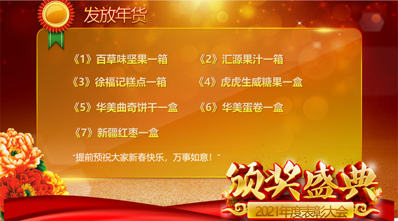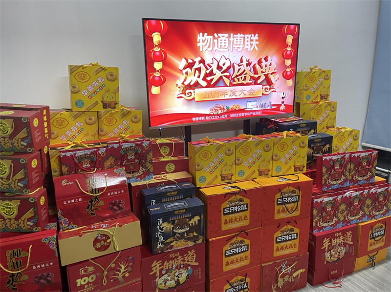 2、物通博聯(lián)為每個員工準(zhǔn)備了豐盛的年貨和晚宴,每個人人均10箱的年貨。