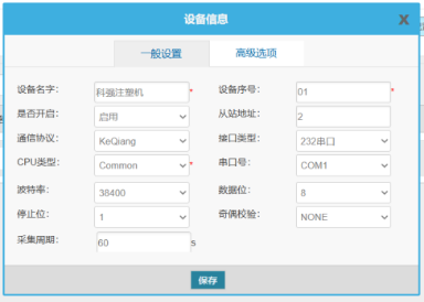 輸入設(shè)備名稱(任意),設(shè)備序號(任意,注意同一網(wǎng)關(guān)下的設(shè)備序號不能重復(fù)),從站地址(設(shè)備站號),通信協(xié)議(KeQiang,根據(jù)注塑機型號選擇),接口類型(232串口),串口號(連接網(wǎng)關(guān)端串口號),以及串口參數(shù)(一般注塑機默認波特率是38400,數(shù)據(jù)位8,無校驗,停止位1),采集周期根據(jù)自身需求設(shè)置,然后點擊保存。