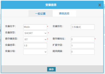 填寫點位相關(guān)信息,變量名(任意),變量別名(任意),變量類型(根據(jù)點位數(shù)據(jù)類型選擇,具體可查看網(wǎng)關(guān)支持的數(shù)據(jù)類型),寄存器類型(固定選擇RT)以及寄存器地址(按照注塑機點位表填寫,例如工作模式對應(yīng)寄存器地址0),然后點擊保存。