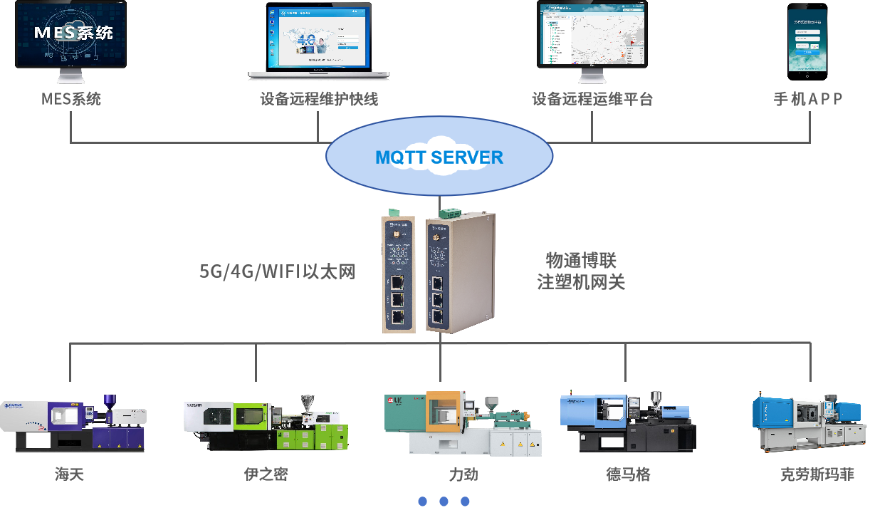 物通博聯(lián)注塑機網(wǎng)關(guān)是一款針對注塑機實現(xiàn)數(shù)據(jù)采集的設(shè)備,主要用于解決注塑機等傳統(tǒng)生產(chǎn)設(shè)備的數(shù)據(jù)采集、遠程監(jiān)控和信息化管理問題,網(wǎng)關(guān)支持各種注塑機的私有協(xié)議和其他工業(yè)標準協(xié)議(弘訊、科強、KEBA、恩格爾、住友、日精……),可以實現(xiàn)各種注塑機設(shè)備聯(lián)網(wǎng)、數(shù)據(jù)采集,實時傳輸注塑機注射壓力、油溫、模具溫度、注射速度等數(shù)據(jù)到本地服務(wù)器、云平臺、MES、ERP等等,為制造業(yè)數(shù)字化轉(zhuǎn)型提供了強大支持。