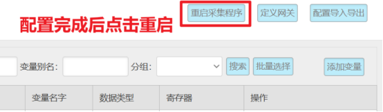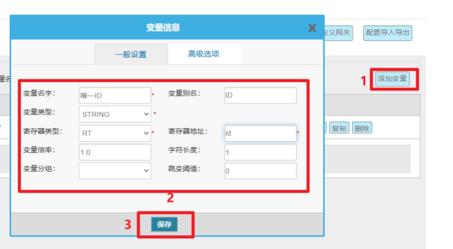 變量配置主要是定義變量名(自定義內(nèi)容,不可使用中文命名)、變量別名(自定義,可使用中文名字)、寄存器類型和寄存器偏移地址,并定義一些數(shù)據(jù)規(guī)則(如:倍率、小數(shù)點(diǎn)、單位、告警)。