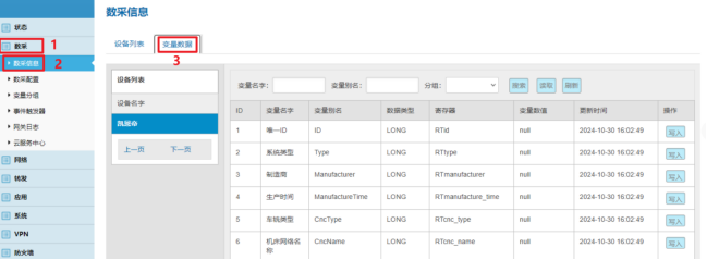數(shù)采配置(設(shè)備信息+變量參數(shù))完成后,重啟采集程序并生效配置即可在:數(shù)采信息---變量數(shù)據(jù)---設(shè)備名稱 中看到采集上來的數(shù)據(jù)。