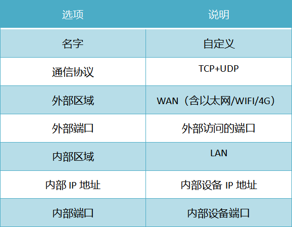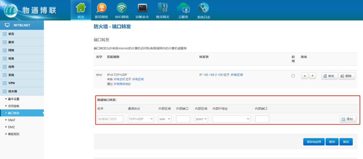 下載中心 視頻中心 常見問題 售后服務 工業網關 設備快線 數據云平臺 聯網設備 問答百科 工業網關如何配置端口映射? 時間:2022-10-26 09:39:53 點擊:6348 關鍵詞:工業網關,網關配置,端口轉發 問題:工業網關如何配置端口映射? 回答: 網關配置界面—防火墻—端口轉發 端口轉發允許來自Internet的計算機訪問私有局域網內的計算機或服務 使用場景:端口轉發是將發往外網的一個端口的通信完全轉發給內網一個地址的指定端口 上一篇:如何通過物通博聯工業網關實現網口設備遠程上下載? 下一篇: 工業智能網關支持的電壓范圍?