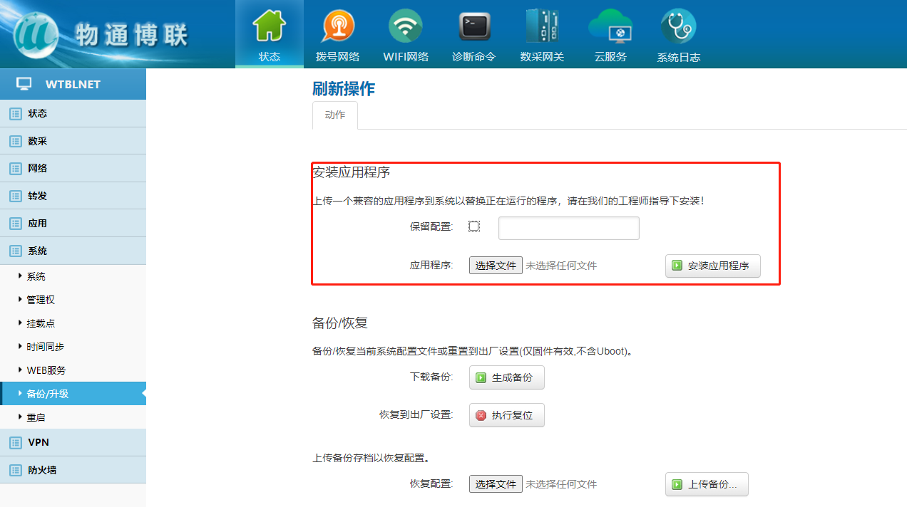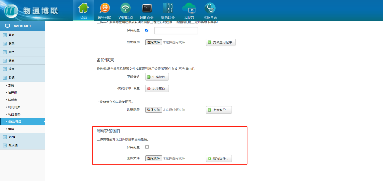 下載中心 視頻中心 常見問題 售后服務 工業網關 設備快線 數據云平臺 聯網設備 問答百科 工業智能網關如何更新程序和固件? 時間:2022-10-26 09:39:53 點擊:6466 關鍵詞:工業智能網關,網關配置,固件升級 問題:工業智能網關如何更新程序和固件? 回答: (1)固件升級:后綴為。bin的文件 點擊系統—備份/升級—選擇文件—刷寫程序(不保留配置) (2)IPK文件升級:后綴為。ipk的文件 點擊系統—備份/升級—選擇文件—輸入密碼—安裝應用程序(不保留配置) 上一篇:工業智能網關時間如何進行同步? 下一篇: 工業智能網關如何連接wifi熱點?