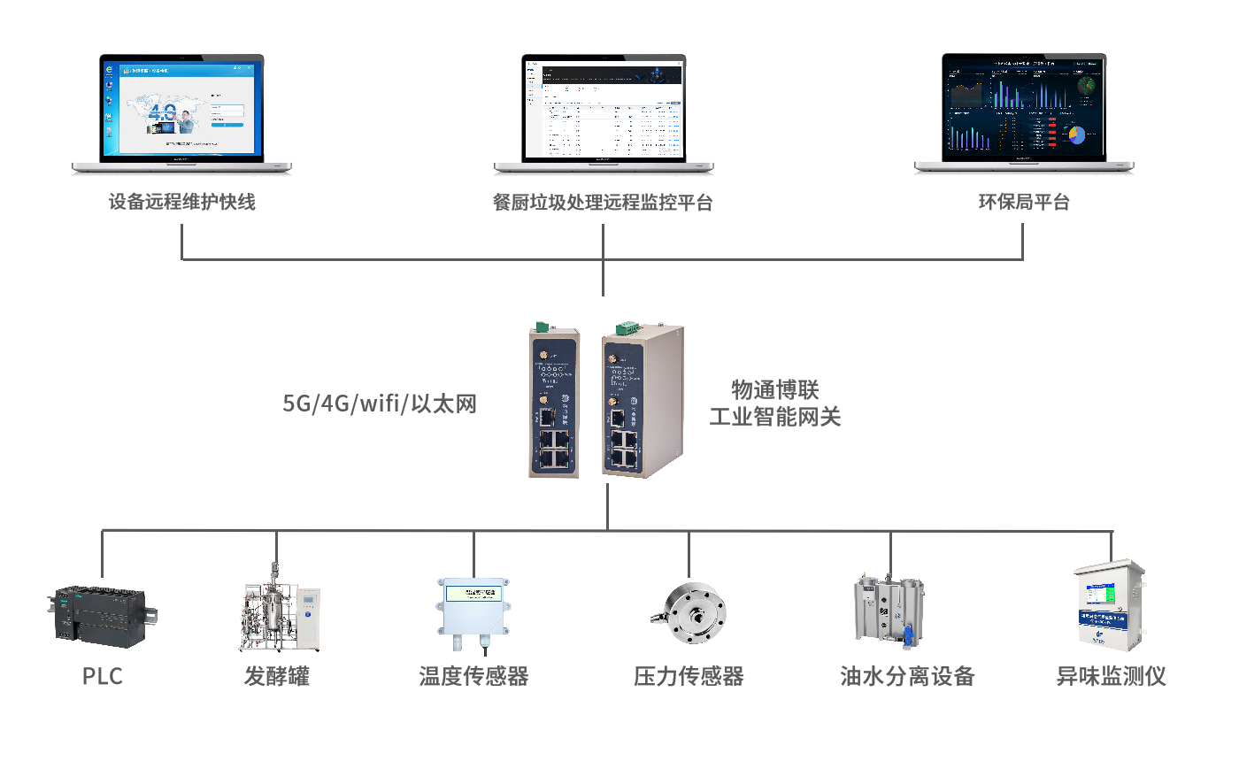 在餐廚垃圾處理設施中安裝傳感器和監測設備,通過物通博聯的工業智能網關采集處理設備(如發酵罐、油水分離設備等)的運行數據(如溫度、轉速、壓力等)、餐廚垃圾處理量數據以及異味排放數據。將采集到的數據傳輸至餐廚垃圾處理遠程監控平臺,平臺對數據進行實時分析和展示。當設備出現異?;虍愇杜欧懦瑯藭r及時發出預警,對餐廚垃圾處理過程中的資源轉化(如油脂提取、沼氣產生等)進行評估,支持遠程運營管理和故障維修。