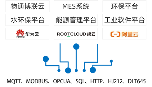 支持通過MQTT、MODBUS、OPCUA、SQL、HTTP數據庫等方式接入遠端軟件平臺(包含:物通博聯云平臺,客戶自主開發的云平臺,根云、美云、華為、阿里、百度、微軟等IOT云平臺,組態軟件、MES系統、ERP系統等工業軟件)