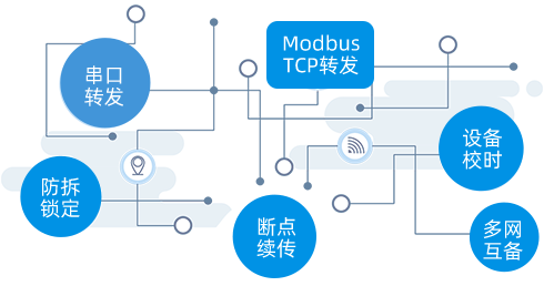 串口轉發、Modbus TCP轉發、設備校時、防拆鎖定、斷點續傳,多網互備等等