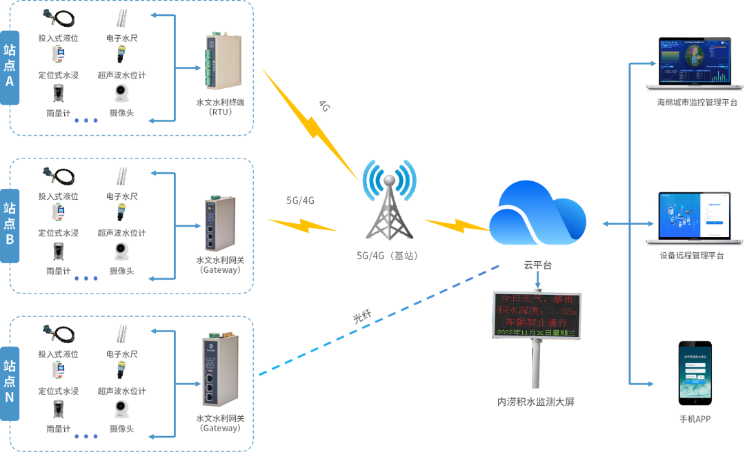 1、支持4G/5G/等多種無線通信方式,可無縫對接雨量傳感器、積水液位計、視頻監控攝像頭等不同品牌、不同接口的監測設備,實現各類數據的統一采集與聯網通信。