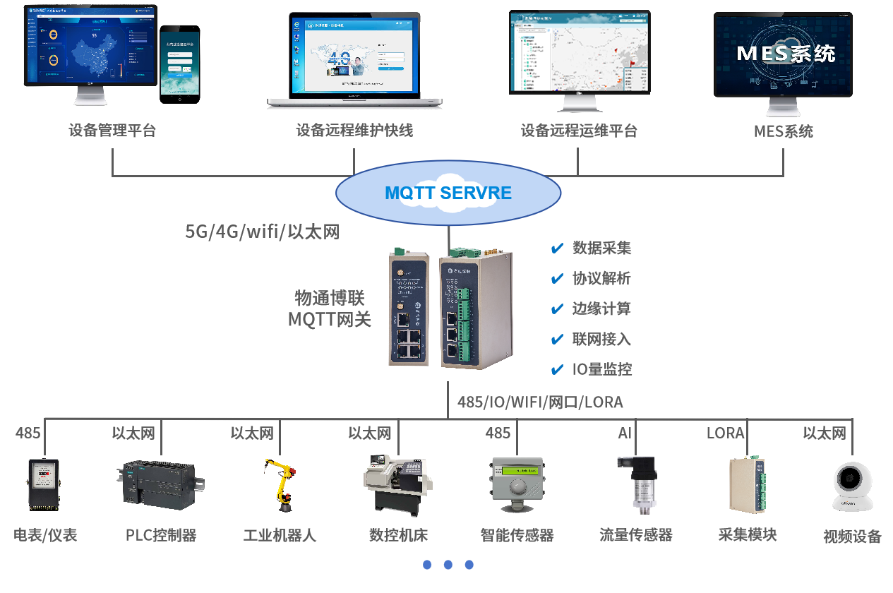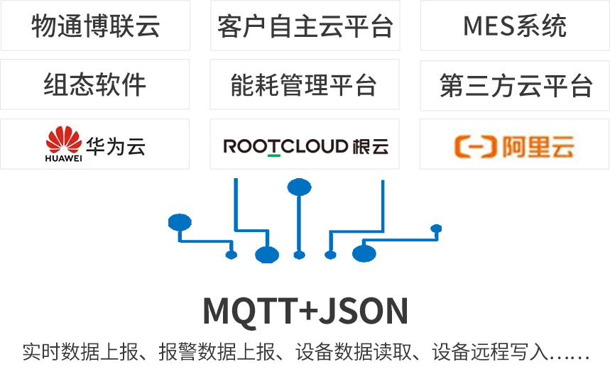 北向支持MQTT協(xié)議接入物通博聯(lián)云平臺,客戶自主開發(fā)的云平臺,第三方云平臺(根云、美云、華為、阿里、百度、微軟等IOT云平臺),組態(tài)軟件、MES系統(tǒng)、ERP系統(tǒng)等工業(yè)軟件