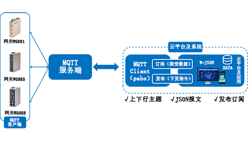 網(wǎng)關內嵌MQTT客戶端,它建立與部署在服務器上的MQTT Broker的雙向通信鏈路;同時客戶自行開發(fā)的云平臺(或本地軟件)也是通過MQTT客戶端來和MQTT Broker來實現(xiàn)訂閱和發(fā)布數(shù)據(jù)的雙向通信。
