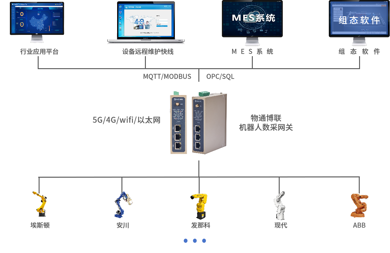 支持將各種機器人設備的協議轉換成Modbus TCP、Modbus RTU、OPC UA、MQTT等協議,實現不同機器人與各種工控軟件和控制器之間的互通互聯。