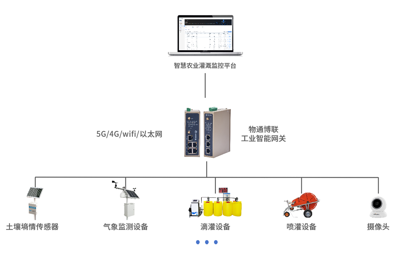 通過物通博聯的工業智能網關采集土壤水分含量、氣象數據(如降雨量、蒸發量等)。將采集到的數據傳輸至智慧農業灌溉監控平臺,平臺對數據進行實時分析和處理,根據土壤墑情和作物需水規律分析灌溉需求,自動控制灌溉設備(如滴灌、噴灌設備等)進行精準灌溉。同時,平臺具備水量統計管理功能,支持遠程灌溉管理和灌溉方案優化。