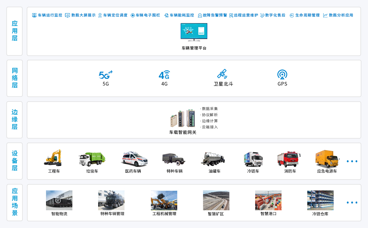 物通博聯(lián)針對(duì)特種車輛數(shù)字化需求,以車載智能網(wǎng)關(guān)為核心,實(shí)時(shí)采集車輛行駛參數(shù)、動(dòng)力系統(tǒng)狀態(tài)、作業(yè)設(shè)備工況等關(guān)鍵數(shù)據(jù),通過(guò)邊緣側(cè)本地化計(jì)算完成數(shù)據(jù)清洗、格式標(biāo)準(zhǔn)化處理。再依托 5G/4G 無(wú)線通信或北斗網(wǎng)絡(luò),將標(biāo)準(zhǔn)化數(shù)據(jù)上傳至特種車輛管理平臺(tái)。平臺(tái)實(shí)現(xiàn)車輛位置實(shí)時(shí)追蹤、運(yùn)行狀態(tài)遠(yuǎn)程監(jiān)控、異常情況及時(shí)預(yù)警,為特種車輛高效調(diào)度與安全管理提供技術(shù)支撐。