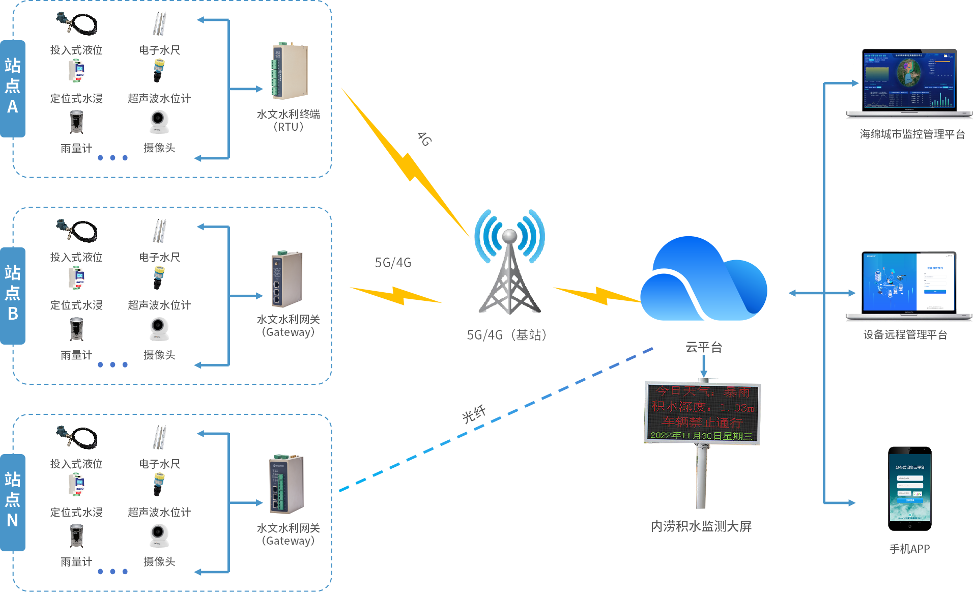 實時監測水位、液位高低、雨量、流速等參數,可設置監測頻率,24小時不間斷運行,可以通過手機端、PC端、數據大屏等實時監測城市內澇積水狀態和視頻畫面。