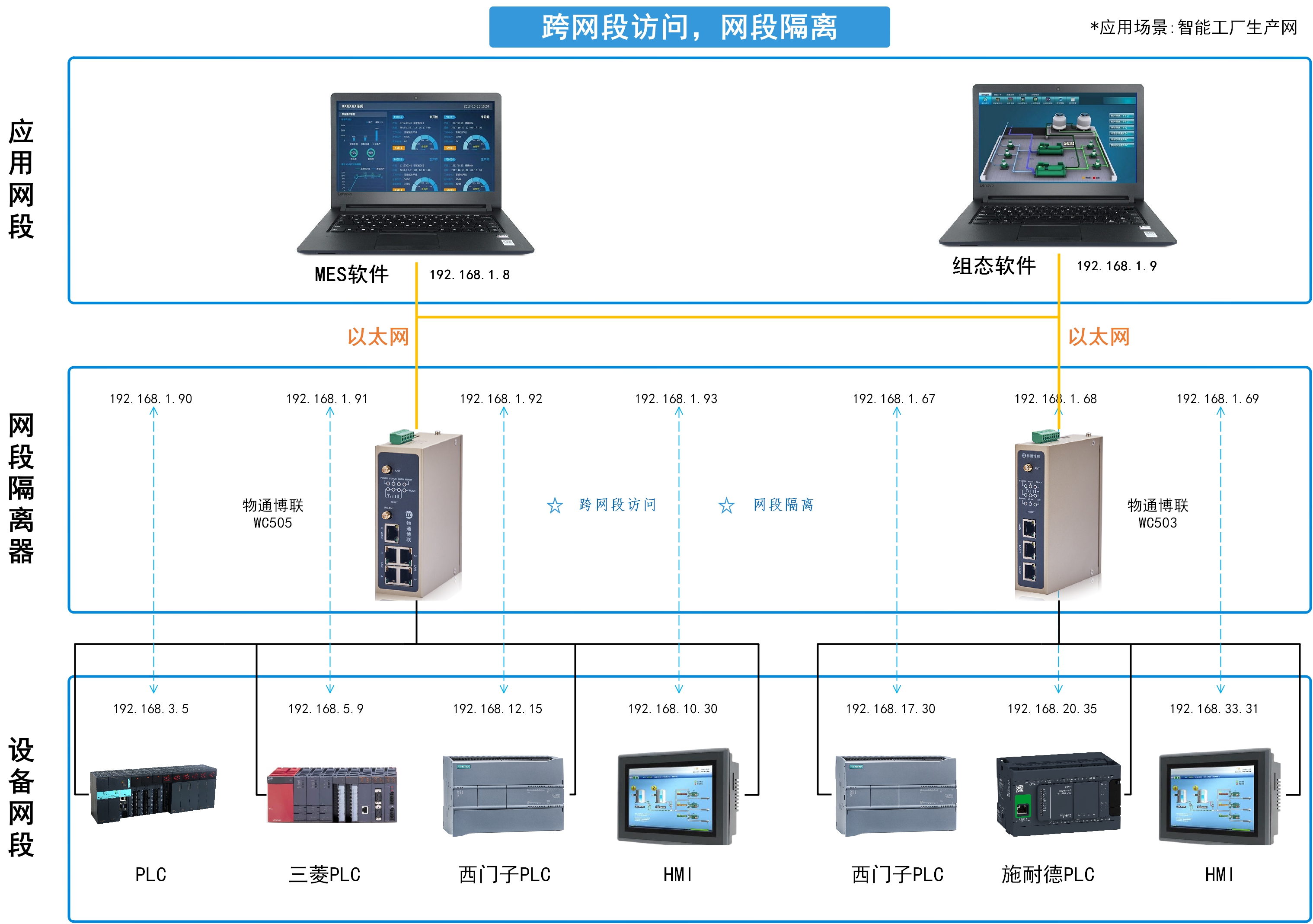 WC503網(wǎng)段隔離器(NAT轉(zhuǎn)換網(wǎng)關(guān))適用于生產(chǎn)網(wǎng)絡(luò)對(duì) PLC、HMI、CNC、DCS、MES等網(wǎng)絡(luò)通訊和數(shù)據(jù)采集,兼有跨網(wǎng)段隔離和IP轉(zhuǎn)換的功能。同時(shí)支持2臺(tái)以上設(shè)備(如PLC、CNC等)網(wǎng)段隔離和NAT 轉(zhuǎn)換;車間多個(gè)設(shè)備,如果有不同網(wǎng)段的IP地址,則可以統(tǒng)一成同一網(wǎng)段的IP地址,進(jìn)行設(shè)備(PLC、CNC)的在線編程、數(shù)據(jù)采集、遠(yuǎn)程管理等各種跨網(wǎng)段訪問。
