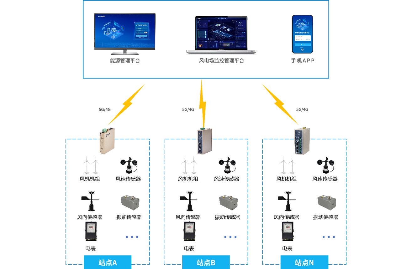 通過物通博聯的工業智能網關采集風力發電場的每臺風機和風速傳感器、風向傳感器、振動傳感器等設備,將采集到的風機運行數據(如轉速、功率、溫度等)傳輸至風電場監控管理平臺。平臺對數據進行實時分析,監測風機運行狀態,當檢測到故障或異常時及時發出預警,并提供故障診斷和維修建議。同時支持遠程控制風機啟停、調整參數等操作,以及優化發電調度。