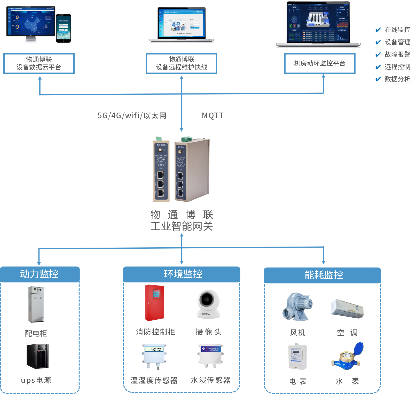物通博聯(lián)推出的機(jī)房動環(huán)在線監(jiān)測系統(tǒng)由工業(yè)智能網(wǎng)關(guān)和物聯(lián)網(wǎng)云平臺組成。物通博聯(lián)工業(yè)智能網(wǎng)關(guān)可以快速接入機(jī)房動環(huán)設(shè)備(配電柜、溫濕度傳感器、ups電源、蓄電池、空調(diào)、風(fēng)機(jī)、攝像頭等)實(shí)現(xiàn)一體化的數(shù)據(jù)采集、規(guī)則報(bào)警、遠(yuǎn)程監(jiān)控等功能。采集到的數(shù)據(jù)支持通過5G/4G/WIFI/以太網(wǎng)等上網(wǎng)方式,將數(shù)據(jù)傳輸?shù)轿锿ú┞?lián)云、企業(yè)私有云、阿里百度華為等第三方云以及本地上位機(jī)軟件。