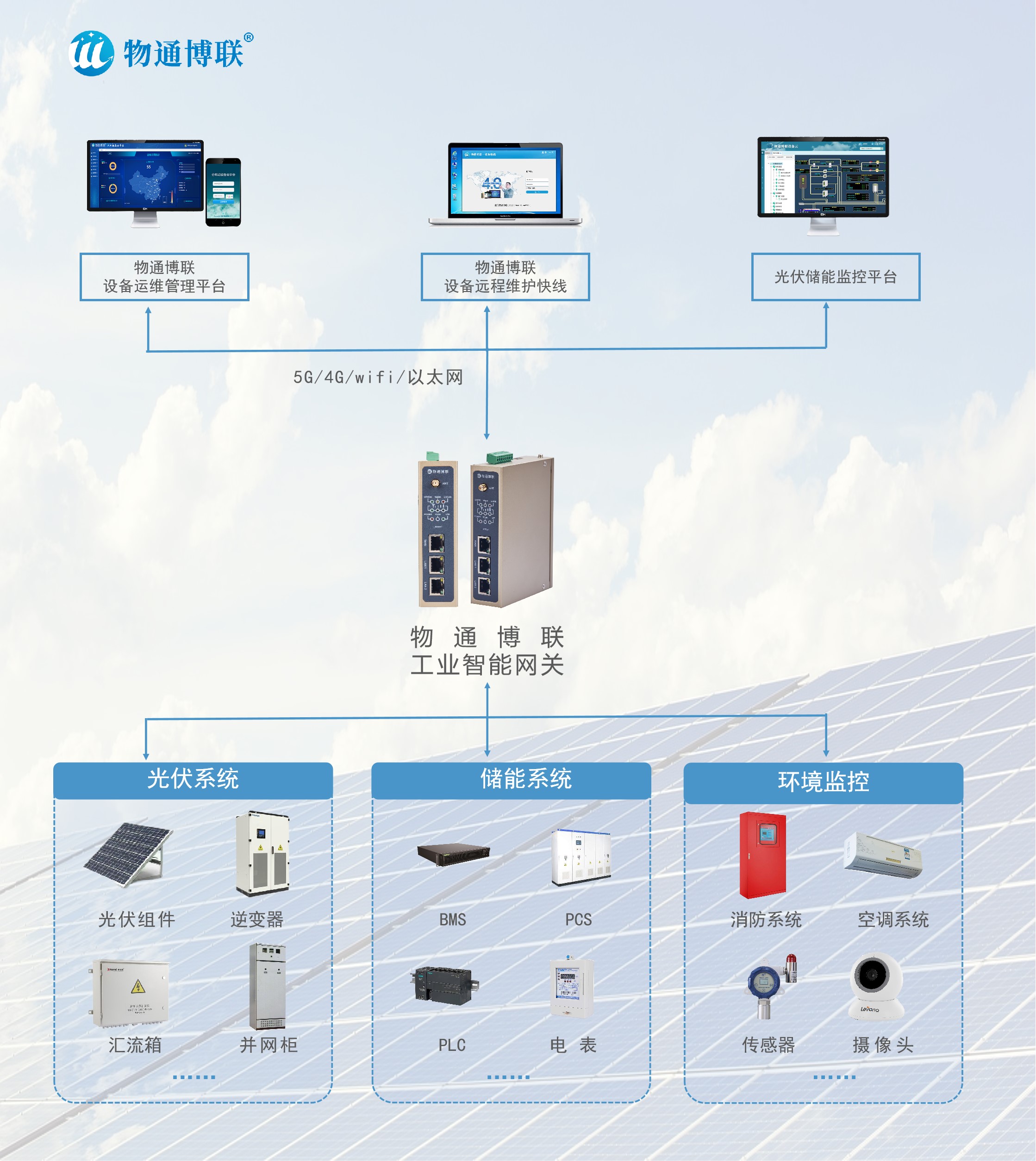 物通博聯工業智能網關采集PLC、傳感器、電表、BMS、PCS、儲能設備、逆變器、斷路器、匯流箱、并網柜、消防系統、空調系統等設備數據到監控平臺,對電站的電壓、電流、功率、溫濕度、太陽輻照度、發電量、電池容量等數據進行實時監測,通過手機電腦等終端監控光伏儲能電站的實時工作狀態和環境情況。