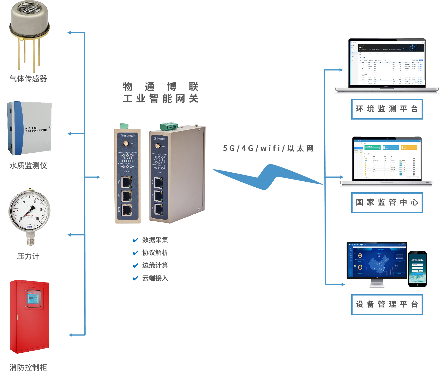 物通博聯的推出環境監測安全預警系統,將工廠內的危險氣體傳感器、廢水監測儀、管道壓力計及消防控制柜PLC接入到工業智能網關中,由工業智能網關采集各項環境參數和設備數據并上傳到上位機或云平臺進行監控和展示,進而實現工廠現場和國家監管中心的聯動監管和實時控制,保證現場環境安全穩定和可控。
