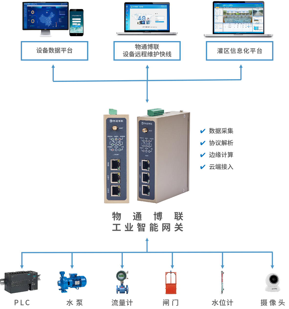 網(wǎng)關(guān)支持采集PLC、傳感器、儀器儀表、攝像頭等設(shè)備數(shù)據(jù),并提供5G/4G等無線通信方式對接到智慧灌區(qū)信息化平臺中。