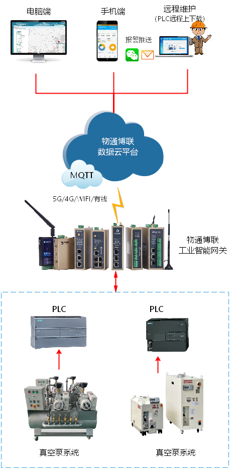 半導體工業正在逐步實現自動化生產,真空泵系統通過PLC自動化控制已經得到廣泛應用,因此只需要將物通博聯工業智能網關接入到PLC,就能實時采集PLC內真空泵的工作參數(壓強、溫度、振動等)并通過5G/4G/WIFI/以太網等方式上傳到云平臺或本地上位機,進而實現設備遠程監控、故障報警、遠程控制及遠程維護等功能。