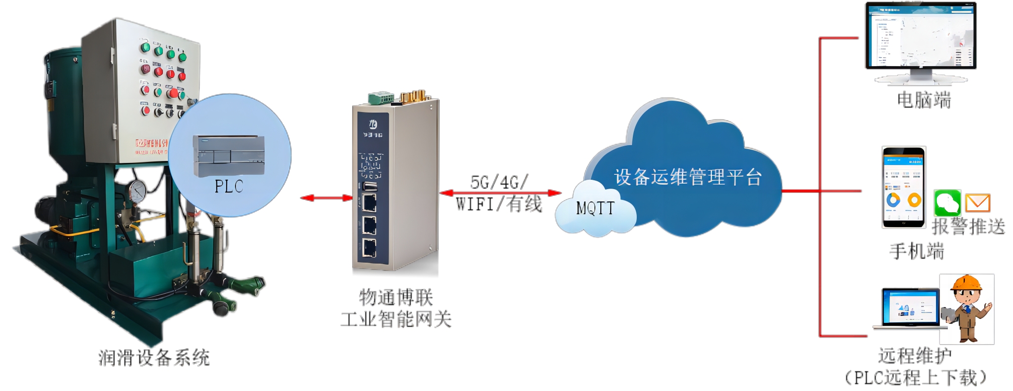 依托工業物聯網、大數據和云計算技術,物通博聯提供“工業智能網關+數據云平臺”的解決方案。通過工業智能網關把分布在各個地區的潤滑設備連接起來,對潤滑設備PLC進行數據采集并通過5G/4G/WIFI等方式上傳到云平臺,實現手機端/電腦端/云組態對設備和項目的監控和管理。