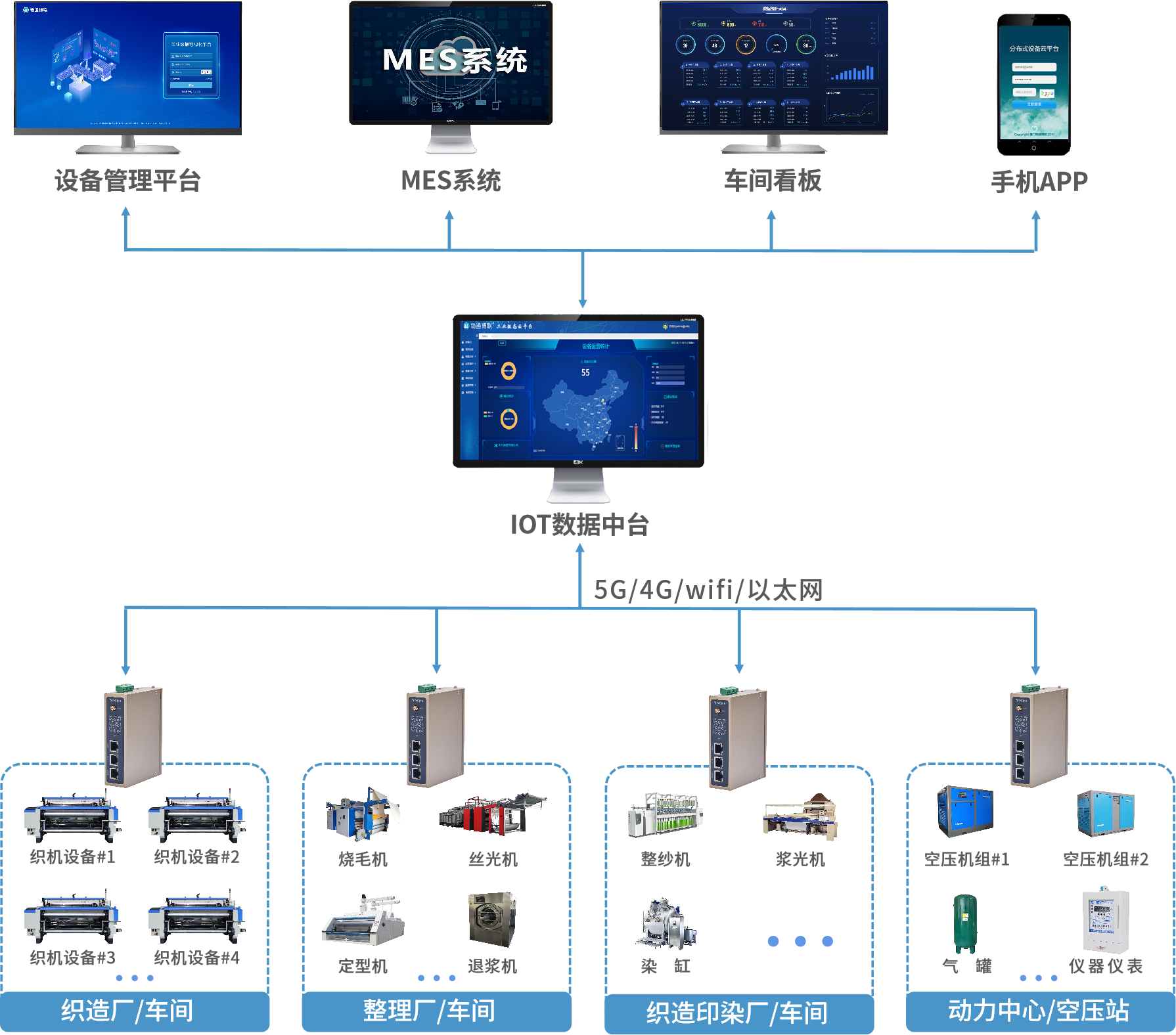 網關為紡織機械PLC提供5G/4G、wifi、以太網等上網方式,適應不同工廠網絡環境需求,提升生產設備聯網率。