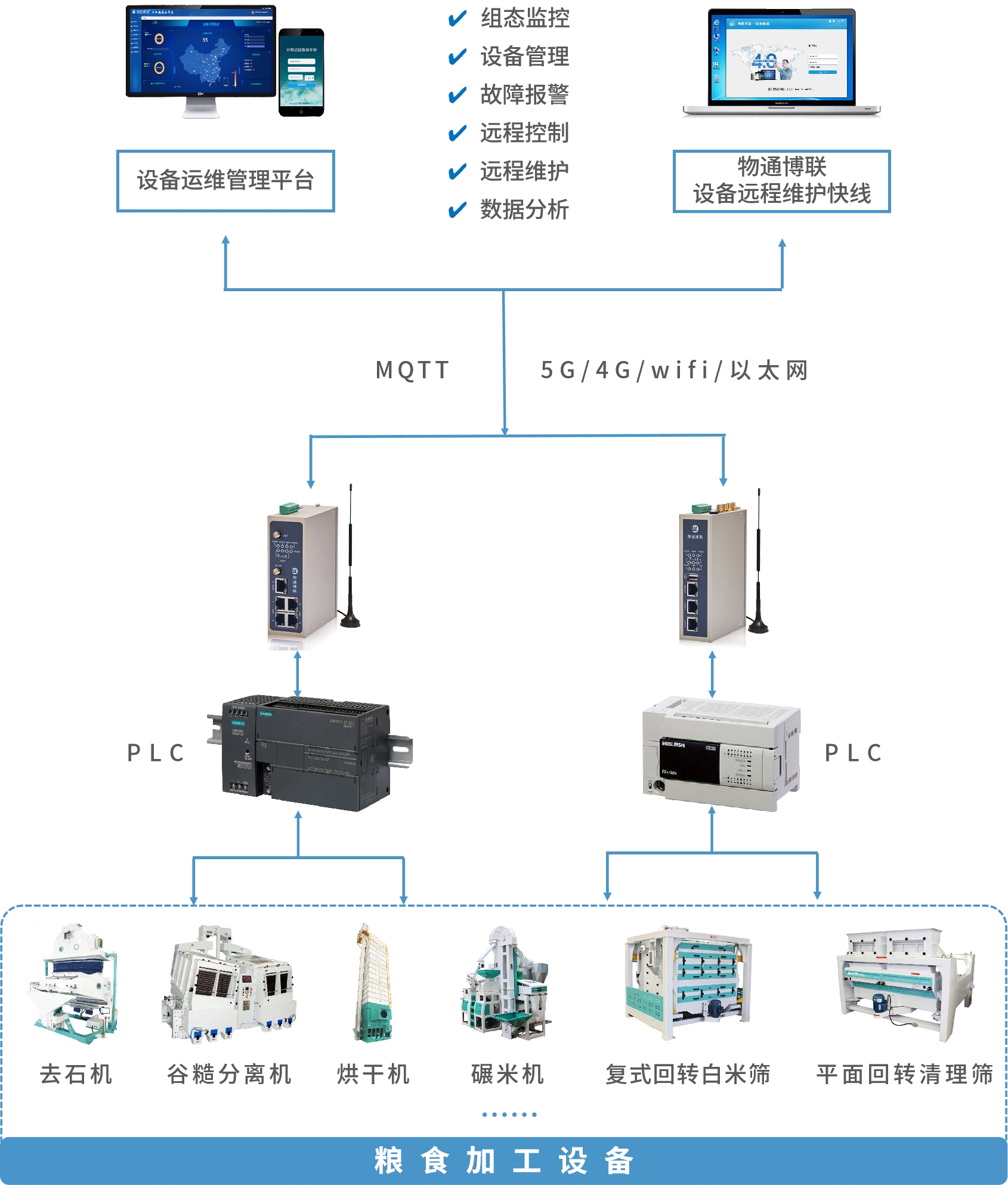 物通博聯提供基于工業智能網關的糧食加工設備遠程監控智慧運維系統解決方案。通過將去石機、碾米機、拋光機、烘干機的控制器PLC接入到物通博聯工業智能網關,網關就能采集設備數據并通過5G/4G網絡上傳到設備運維管理平臺中,從而實現對設備位置分布、數量類型、運行狀態、告警事件、運維工單等監控和管理,從而綜合運用大數據分析技術,驅動企業運營決策與服務升級,有效加強售后市場建設,增強市場競爭力。