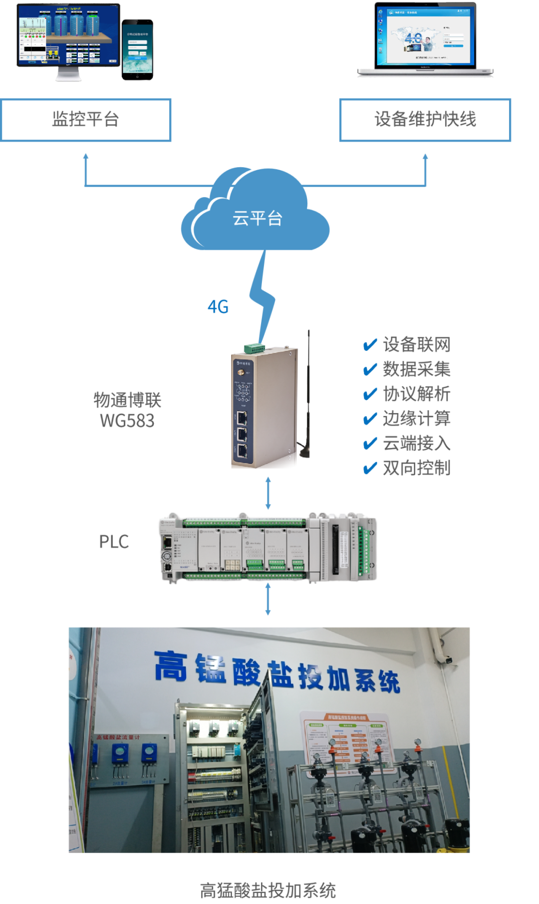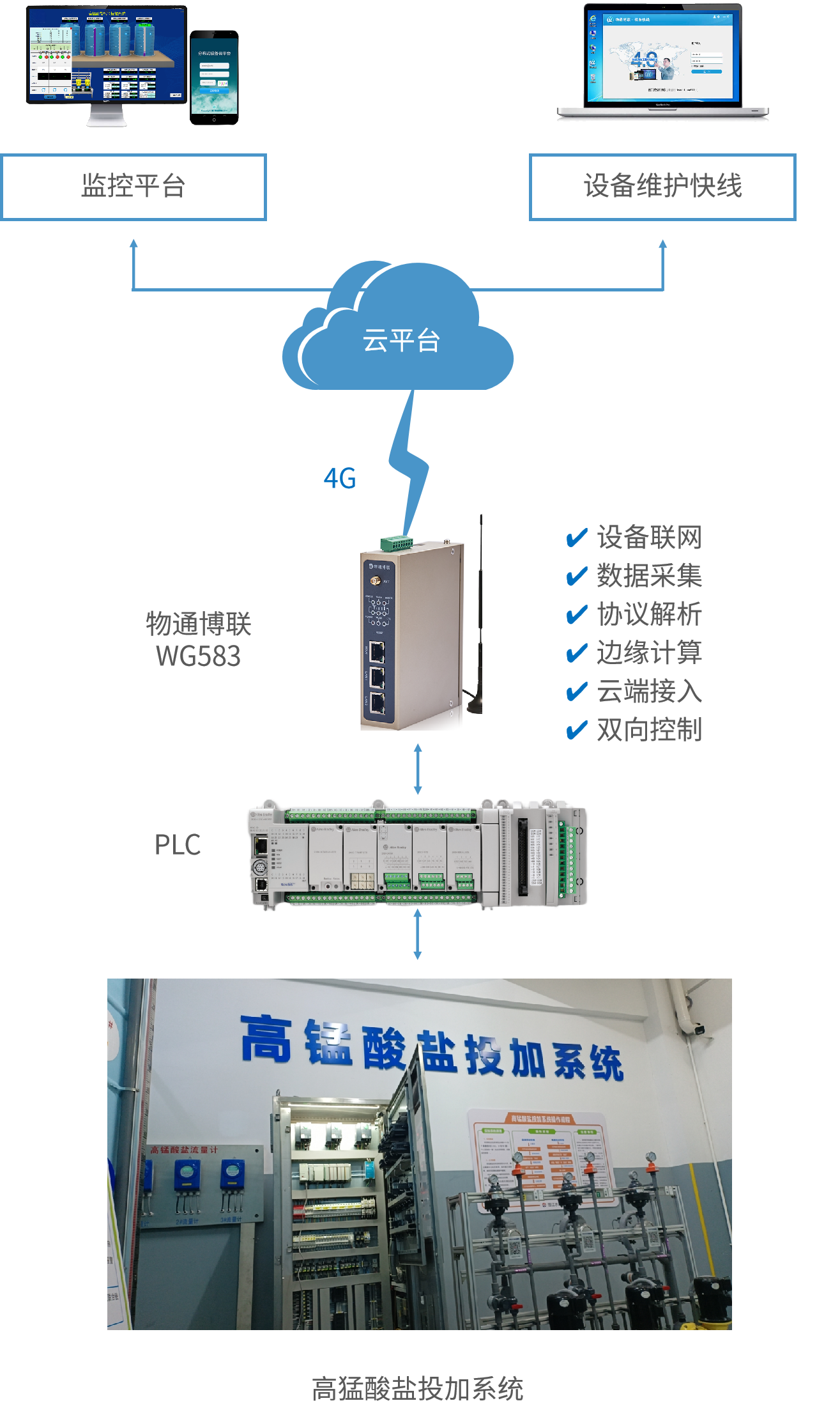 該自來水公司是一家致力于“供排水一體化、城鄉(xiāng)水務(wù)一體化、投資建設(shè)運營一體化”的水務(wù)一體化運營企業(yè)。本次項目使用物通博聯(lián)工業(yè)智能網(wǎng)關(guān)+IOT云平臺搭建高錳酸鹽投加設(shè)備物聯(lián)網(wǎng)系統(tǒng),旨在實現(xiàn)對自來水廠水務(wù)進行智慧管理,確保穩(wěn)定高效運行。