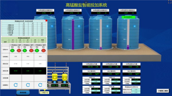 基于云組態(tài)功能還原加藥工藝流程,快速查詢高錳酸鉀儲液罐、計量泵、配水池等設(shè)備狀態(tài)與工藝參數(shù),一目了然。