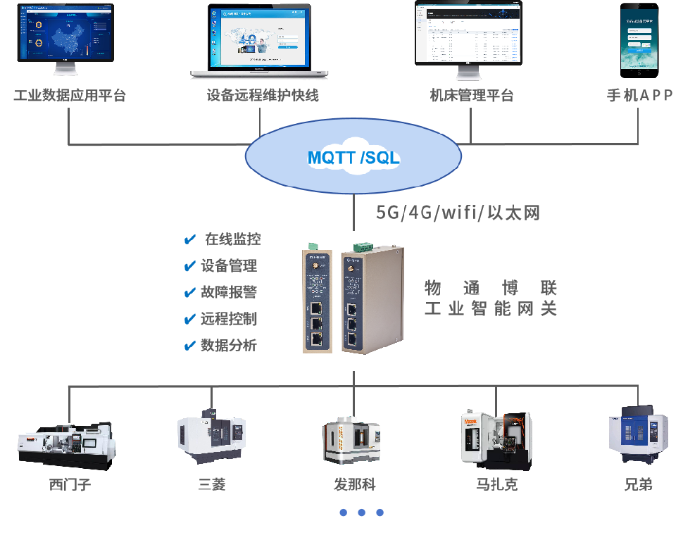 物通博聯推出的工業智能網關能夠接入西門子、三菱、馬扎克、發那科、海德漢、哈斯、兄弟、臺灣寶元、廣州數控等數控機床,實時采集設備數據、加工數據、刀具數據、生產數據等并對接到工廠MES系統、ERP系統中,從而實現手機端、電腦端、車間看板對各項數據的展示、告警、管理與分析,為生產、運維、物料等相關工作開展提供全面準確的數據支持,助力企業制定科學合理決策,促進高質量發展。