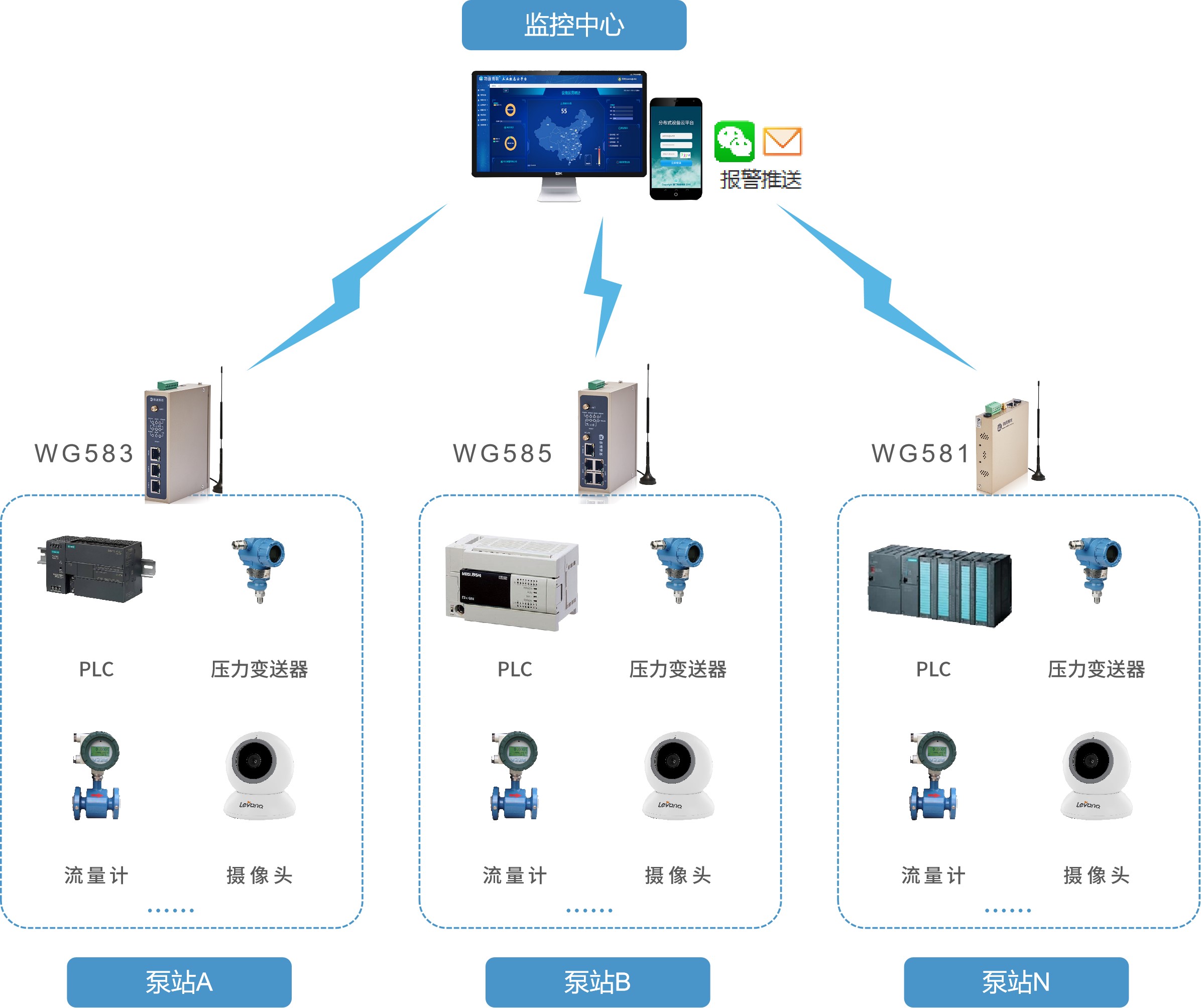 通過接入水泵控制柜PLC、壓力計、流量計、攝像頭等設(shè)備,物通博聯(lián)水利監(jiān)測網(wǎng)關(guān)能夠?qū)崟r采集水泵閥門的運行狀態(tài)與工藝參數(shù)、管網(wǎng)水壓及流量、現(xiàn)場視頻等數(shù)據(jù),并通過5G/4G無線網(wǎng)絡(luò)上傳到泵站監(jiān)控管理平臺中,從而實現(xiàn)遠(yuǎn)程監(jiān)控、自動告警、遠(yuǎn)程控制、運維管理、遠(yuǎn)程維護(hù)多種功能,從而為泵站巡檢運維與數(shù)據(jù)分析等工作提供全面可靠的數(shù)據(jù)支持,助力做出科學(xué)合理決策,有效加強泵站管理水平,保障取水安全。