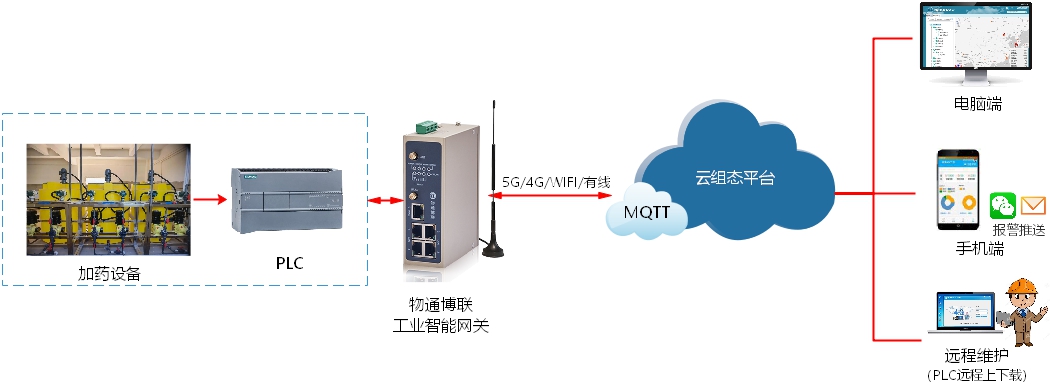 物通博聯提供污水處理加藥設備云組態遠程監控系統方案。通過將物通博聯工業智能網關接入加藥設備控制器 PLC,實時采集數據并通過5G/4G/WIFI/以太網等網絡對接到物通博聯云組態平臺中,進行編輯繪制搭建組態大屏,從而直觀展示污水處理加藥設備的運行狀態與工藝參數,并在出現異常時自動告警,從而靈活運用遠程控制、遠程維護、數據分析等手段,提高工作效率并減少人工成本,保障污水處理工作安全、高效開展。