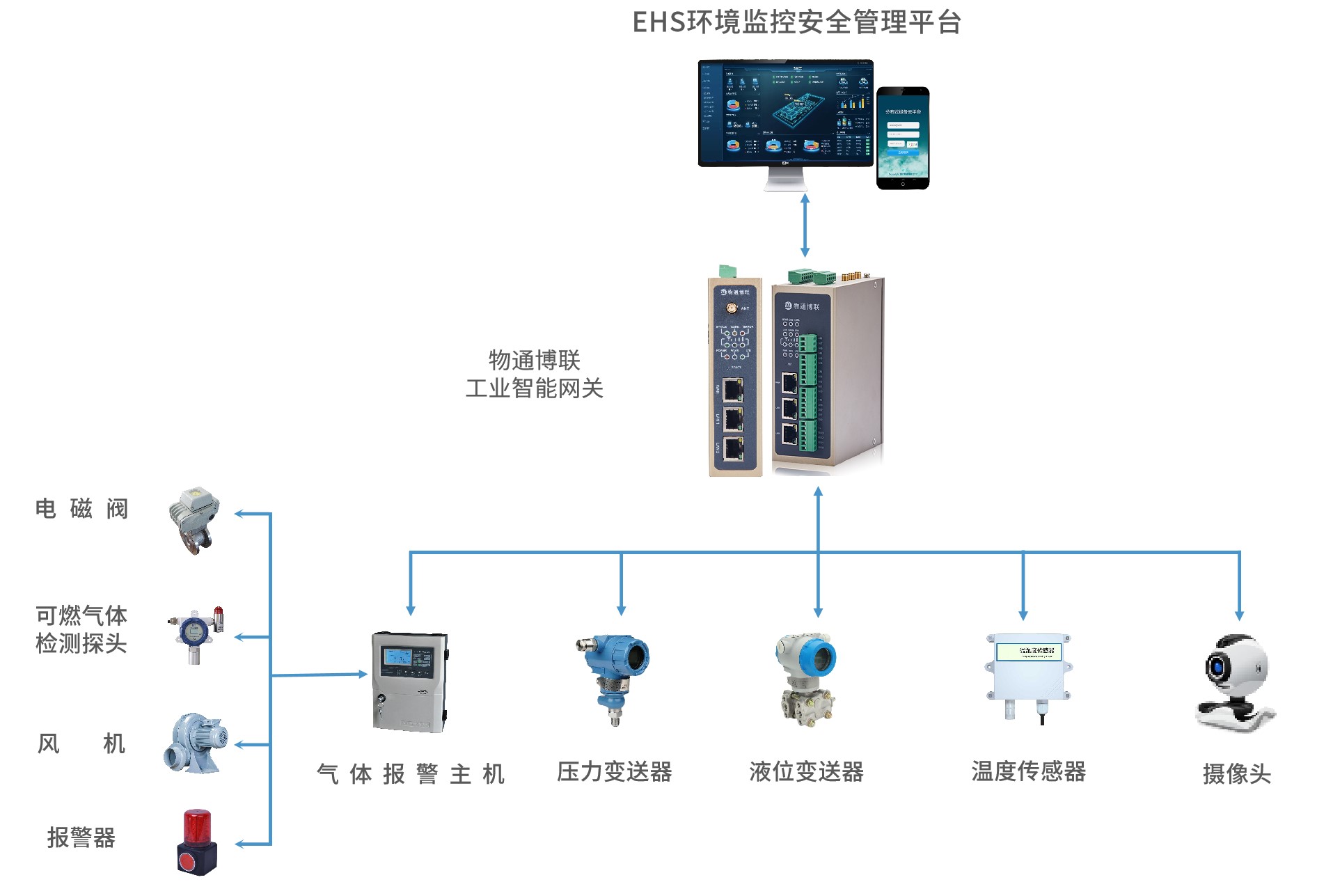 現場可燃氣體探測主機為RS485串口,通過接入物通博聯工業智能網關,能夠實時采集液位、壓力、溫度等數據,并通過工廠局域網對接到EHS環境監控安全管理平臺中,從而實現車間各點位環境參數的實時監控、超限告警、在線管理等,及時采取措施管理控制,保證車間環境安全,避免出現意外事故與經濟損失。