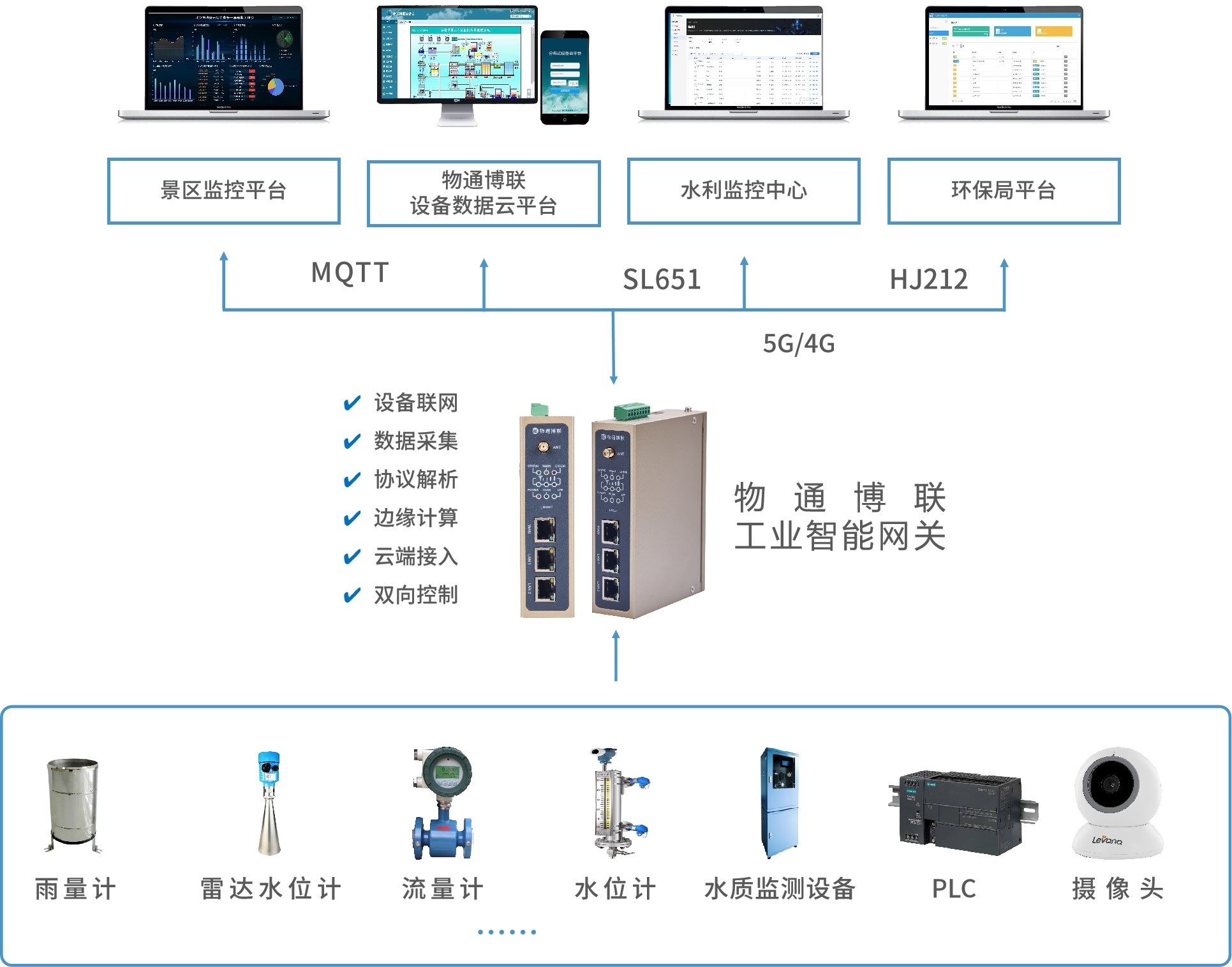 采集水位、降雨量、流量、水質、濁度、視頻等多維度數據,并通過無線網絡5G/4G傳輸到景區管理平臺和水利管理平臺中進行實時監控。