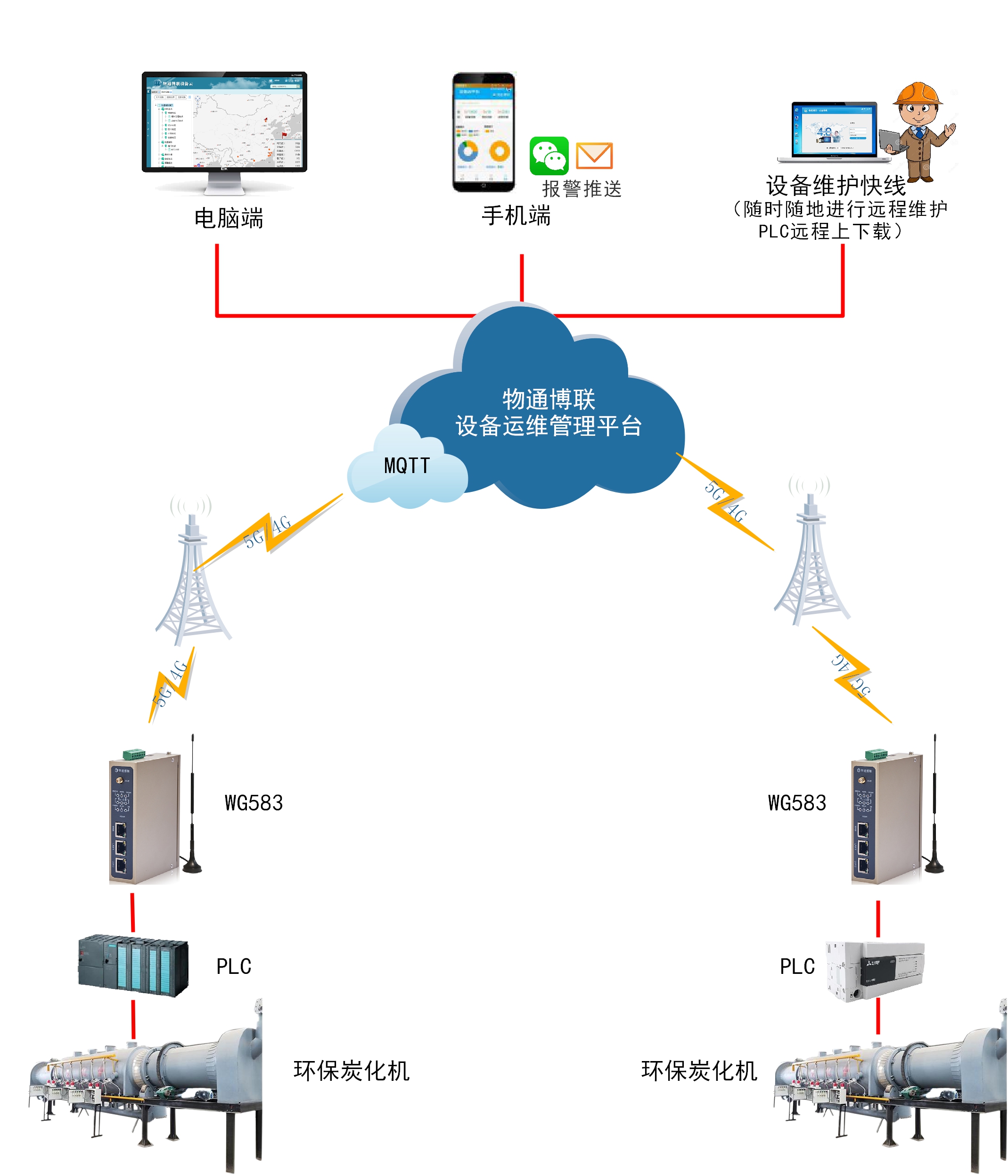管理人員可通過電腦、手機等終端,隨時了解掌握炭化設備組態畫面、溫度曲線圖、告警報表等信息,無需現場巡查即可實時全面掌握設備狀態。