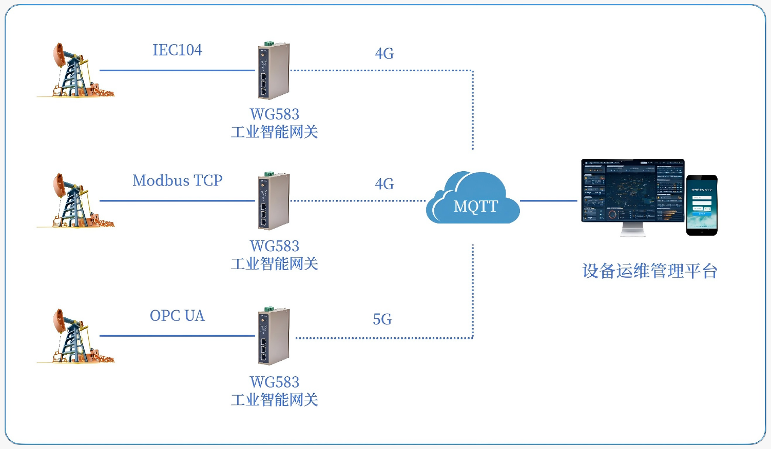 WG583網(wǎng)關(guān)支持邊緣側(cè)數(shù)據(jù)預(yù)處理,過(guò)濾無(wú)效數(shù)據(jù)并進(jìn)行標(biāo)準(zhǔn)化轉(zhuǎn)換,隨后以5G/4G網(wǎng)絡(luò)通過(guò)輕量級(jí)MQTT物聯(lián)網(wǎng)協(xié)議進(jìn)行數(shù)據(jù)對(duì)接到智慧油田管理平臺(tái)中,通過(guò)多網(wǎng)互備、斷網(wǎng)重連、斷點(diǎn)續(xù)傳、安全加密等多種功能,保障數(shù)據(jù)安全完整傳輸。