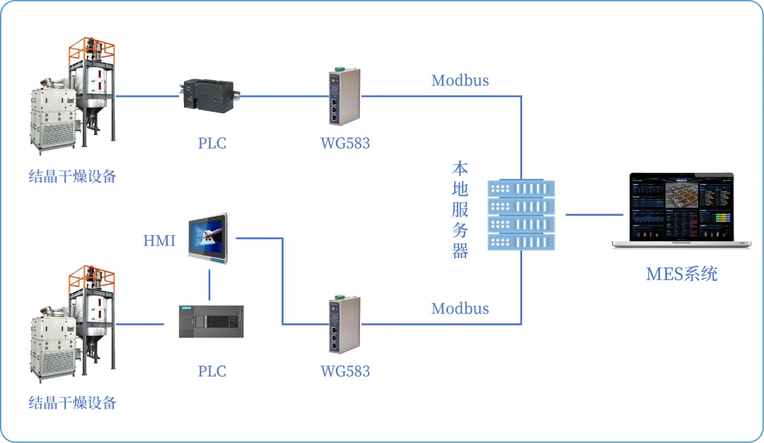 能夠實時采集結晶干燥設備的運行狀態(運行/停機/故障)、關鍵工藝參數(結晶溫度、干燥濕度、物料液位、實時風力等),支持5G/4G/WiFi/以太網等多種上網方式,上傳數據進行監控。